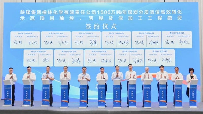 國(guó)家開(kāi)發(fā)銀行陜西省分行、農(nóng)業(yè)銀行陜西省分行、中國(guó)銀行陜西省分行、交通銀行陜西省分行、建設(shè)銀行陜西省分行、進(jìn)出口銀行陜西省分行、工商銀行陜西省分行、招商銀行西安分行、浦發(fā)銀行西安分行、興業(yè)銀行西安分行、北京銀行西安分行共11家金融機(jī)構(gòu)相關(guān)負(fù)責(zé)人與陜煤集團(tuán)榆林化學(xué)簽約,將為榆林化學(xué)項(xiàng)目投資建設(shè)、產(chǎn)業(yè)轉(zhuǎn)型升級(jí)提供資金支持和保障。