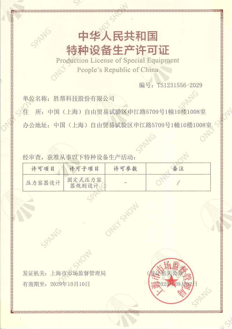 近日,勝幫科技喜獲由上海市市場(chǎng)監(jiān)督管理局頒發(fā)的特種設(shè)備生產(chǎn)許可證(壓力容器設(shè)計(jì))新證書。特種設(shè)備生產(chǎn)許可證(壓力容器設(shè)計(jì))四年換證一次,自2009年首次取證后,歷經(jīng)三次換證,本次已是公司第四次成功換證。