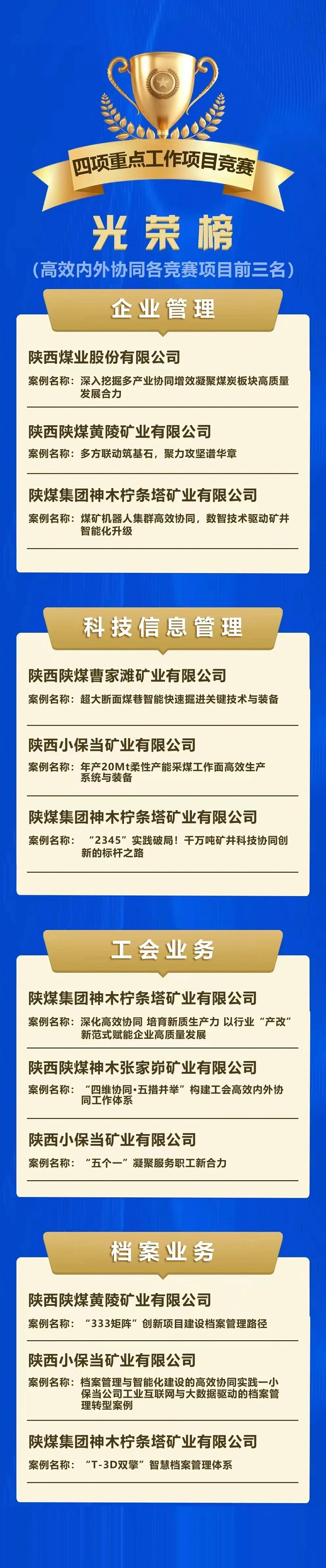 10月23日至24日,陜煤集團(tuán)在曹家灘礦業(yè)公司舉辦高效內(nèi)外協(xié)同業(yè)務(wù)競賽。62支參賽隊伍在企業(yè)管理、科技信息管理、工會業(yè)務(wù)、檔案業(yè)務(wù)4個賽項中激烈角逐,最終評選出金銀銅獎和金牌案例主創(chuàng)。集團(tuán)公司黨委委員、工會主席、職工董事李向東及賽項部門負(fù)責(zé)人分別為各賽項獲獎單位和個人頒獎。