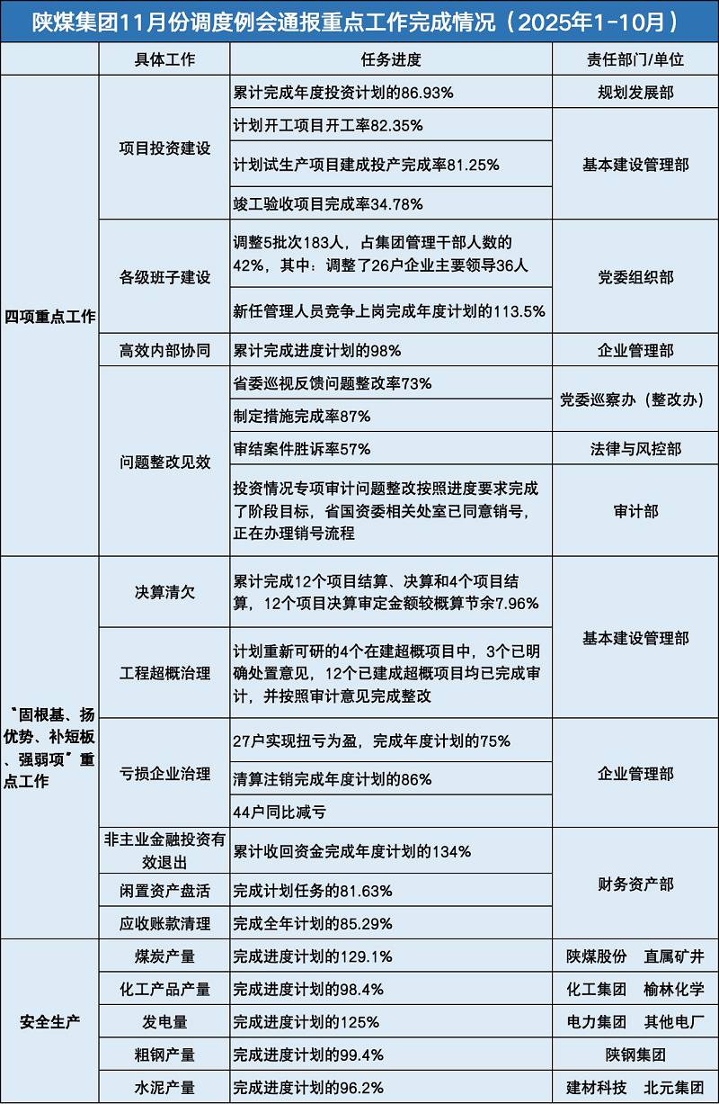 會議總結10月份重點任務完成情況,分析當前工作存在的問題和不足,安排11月份重點工作;相關職能部門分別匯報了項目投資建設、高效協(xié)同發(fā)展、各級班子建設、各類問題整改及安全環(huán)保、生產(chǎn)經(jīng)營、閑置資產(chǎn)盤活、虧損企業(yè)治理等重點工作推進情況。