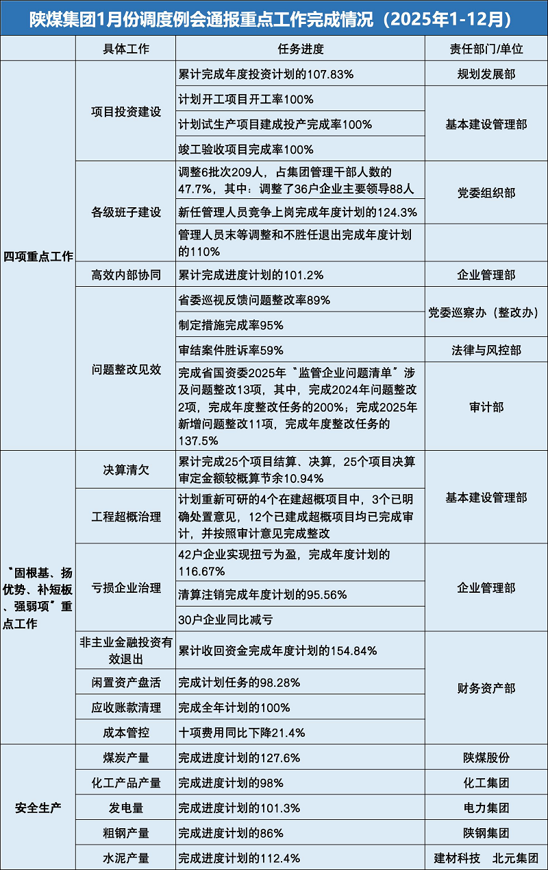 會議總結(jié)12月份及2025年重點工作任務(wù)完成情況,分析當(dāng)前工作存在的問題和不足,安排部署近期重點工作;相關(guān)職能部門分別匯報了項目投資建設(shè)、高效協(xié)同發(fā)展、各級班子建設(shè)、問題整改及安全環(huán)保、生產(chǎn)經(jīng)營、閑置資產(chǎn)盤活、虧損企業(yè)治理等重點工作推進(jìn)情況。