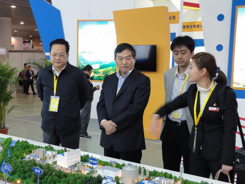 集團公司總經(jīng)理楊照乾、黨委副書記馬富元在集團展區(qū)內(nèi)聽取工作人員講解黃陵循環(huán)經(jīng)濟發(fā)展情況