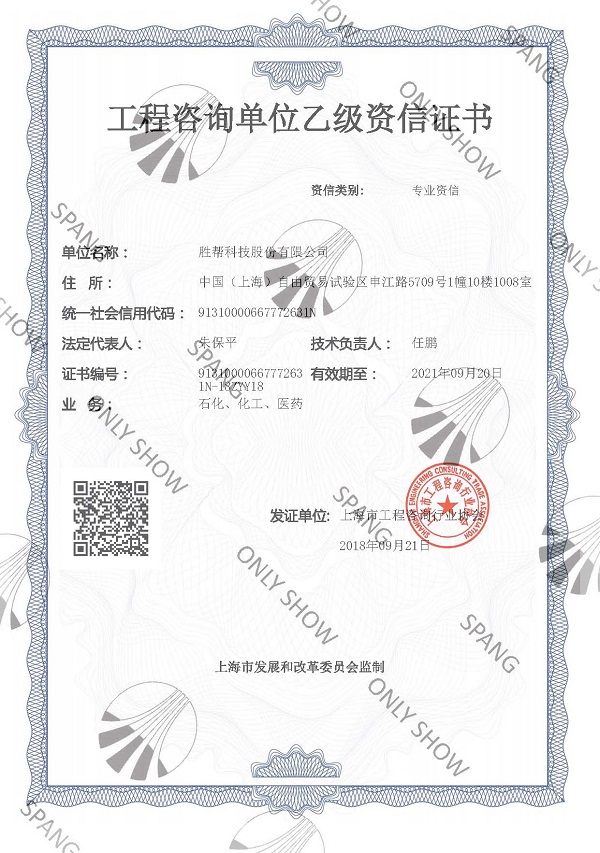 近日,公司獲上海市工程咨詢行業(yè)協(xié)會(huì)下發(fā)、上海市發(fā)展和改革委員會(huì)監(jiān)制的工程咨詢單位乙級(jí)資信證書,該證書的獲得標(biāo)志著公司已順利通過石化、化工、醫(yī)藥專業(yè)的工程咨詢資信評(píng)價(jià)乙級(jí)認(rèn)定。